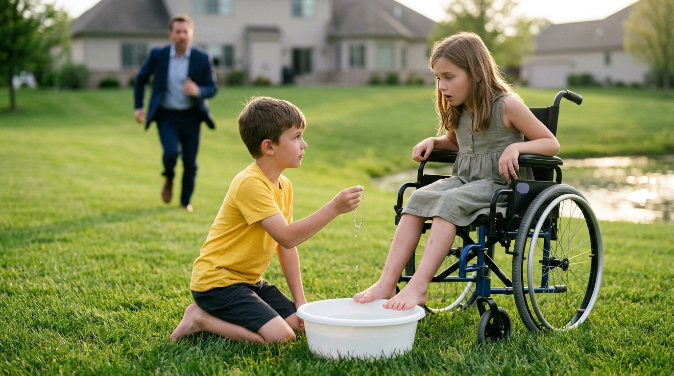 My daughter, Isabelle, sat in her wheelchair near the fountain at the center of the lawn. Her blanket had slipped from her knees. Her bare feet rested in a white plastic basin filled with warm water, and the boy was washing them with a gentleness that made no sense.