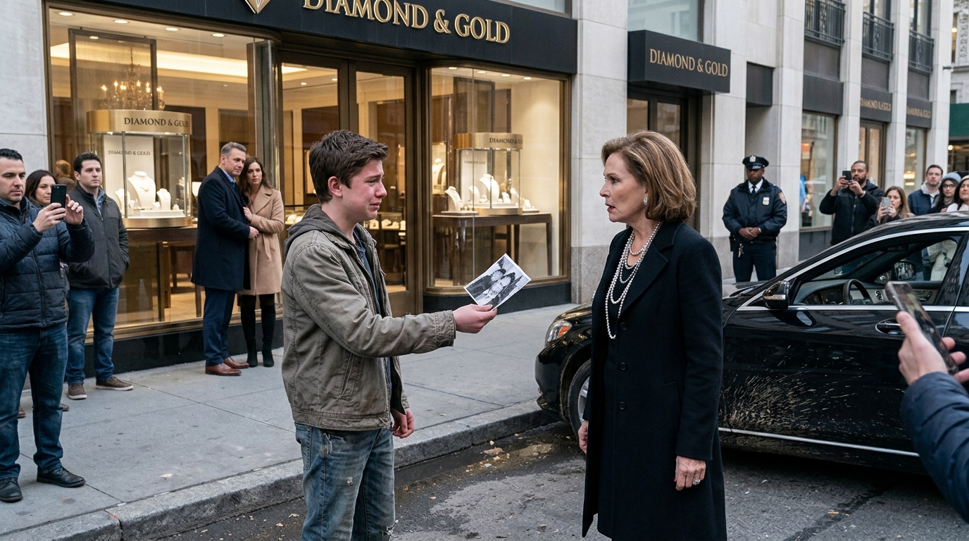 I stepped out of the boutique with a diamond necklace still cold against my throat and saw him standing there.