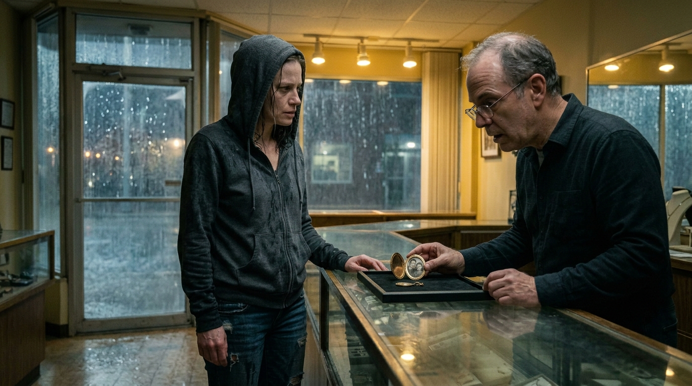 My jewelry shop was small, old, and warm from the yellow lamps above the display cases. Outside, rain beat against the windows hard enough to blur the streetlights. Most people avoided pawn counters on evenings like that unless desperation had already made the decision for them.