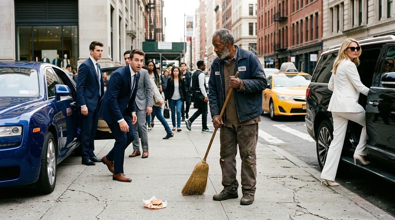He moved quietly between rushing feet, coffee spills, taxi exhaust, cigarette ends, and wrappers dropped by people too busy to notice the man cleaning up after them.