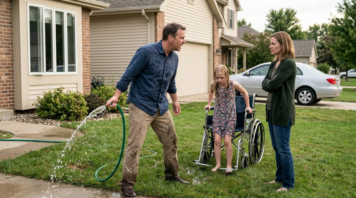 Lily sat in her wheelchair near the garden path, soaked from head to toe. Her blonde hair clung to her cheeks. Her pale dress stuck to her arms. Water streamed from the wheels of the chair and pooled beneath her feet.