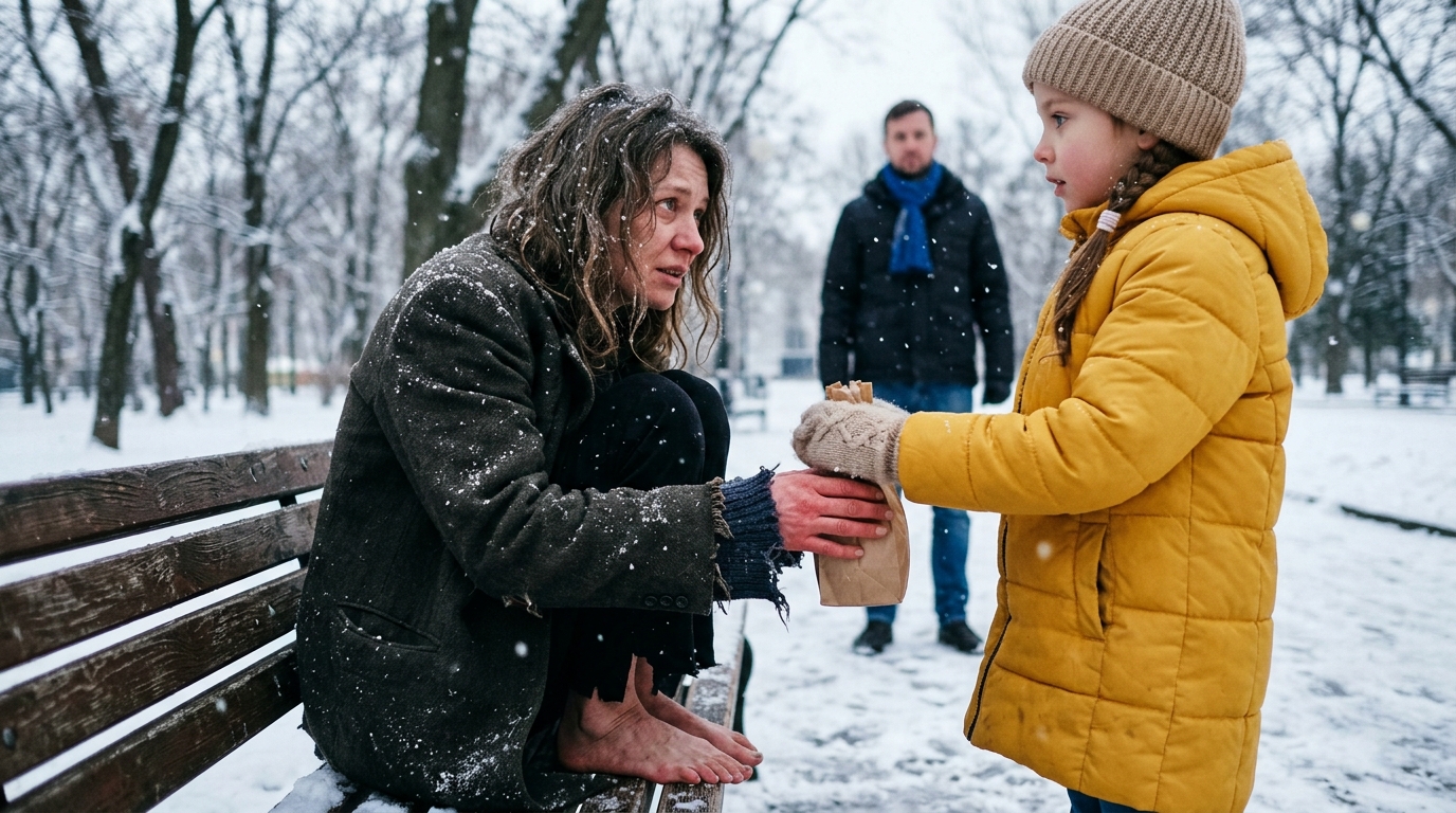 The woman seemed young, though hardship had made her age difficult to read. Maybe thirty. Maybe forty. Her cheeks were hollow. Her lips were faintly blue. Snow collected in her hair without her brushing it away.